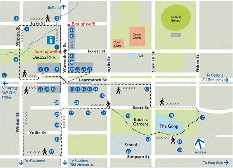 See Buninyong's Walks website Walks Around Buninyong and District for detailed maps, descriptions and points of interest on a wide range of interesting walks around Buninyong.