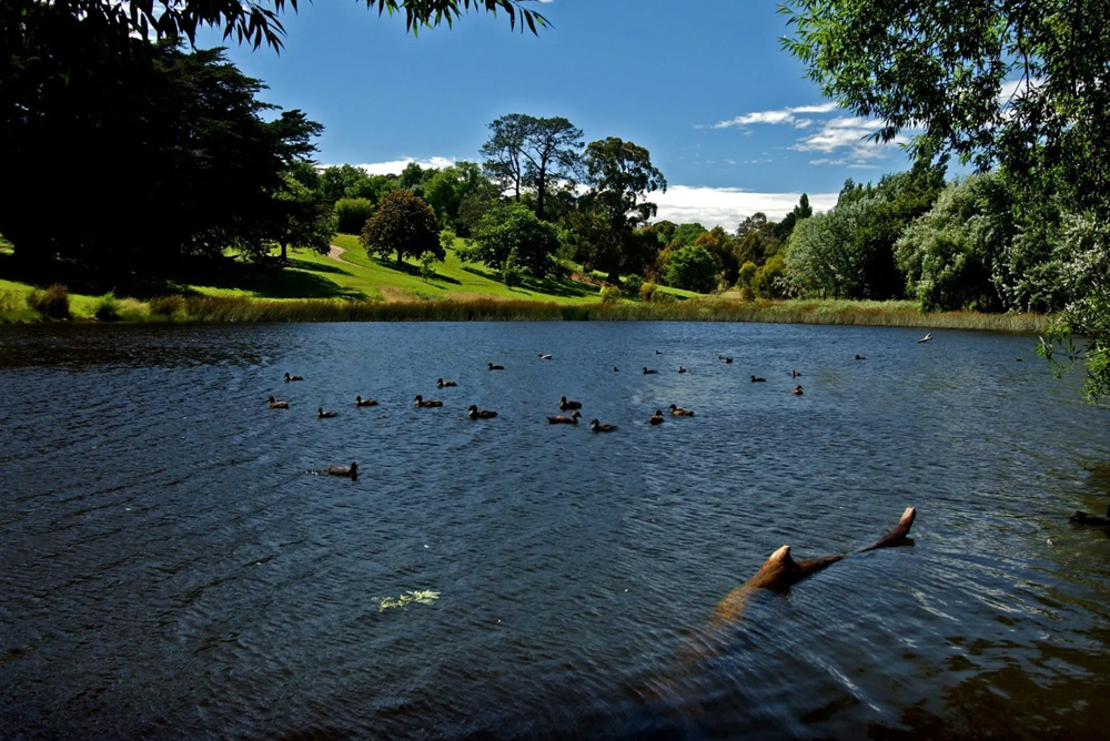 Gravel paths with gentle gradients wind amongst lawns shaded by mature trees and over small bridges crossing a small stream and ponds in Buninyong's atmospheric Lower Botanic Gardens. Facilities such as a rotunda, children's play areas, barbecues, and toilets make this restful place popular for picnics.