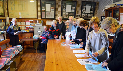 Newsletter committee members collating the last copy of the print-only version of the Buninyong News, in the Old Library, July 2012